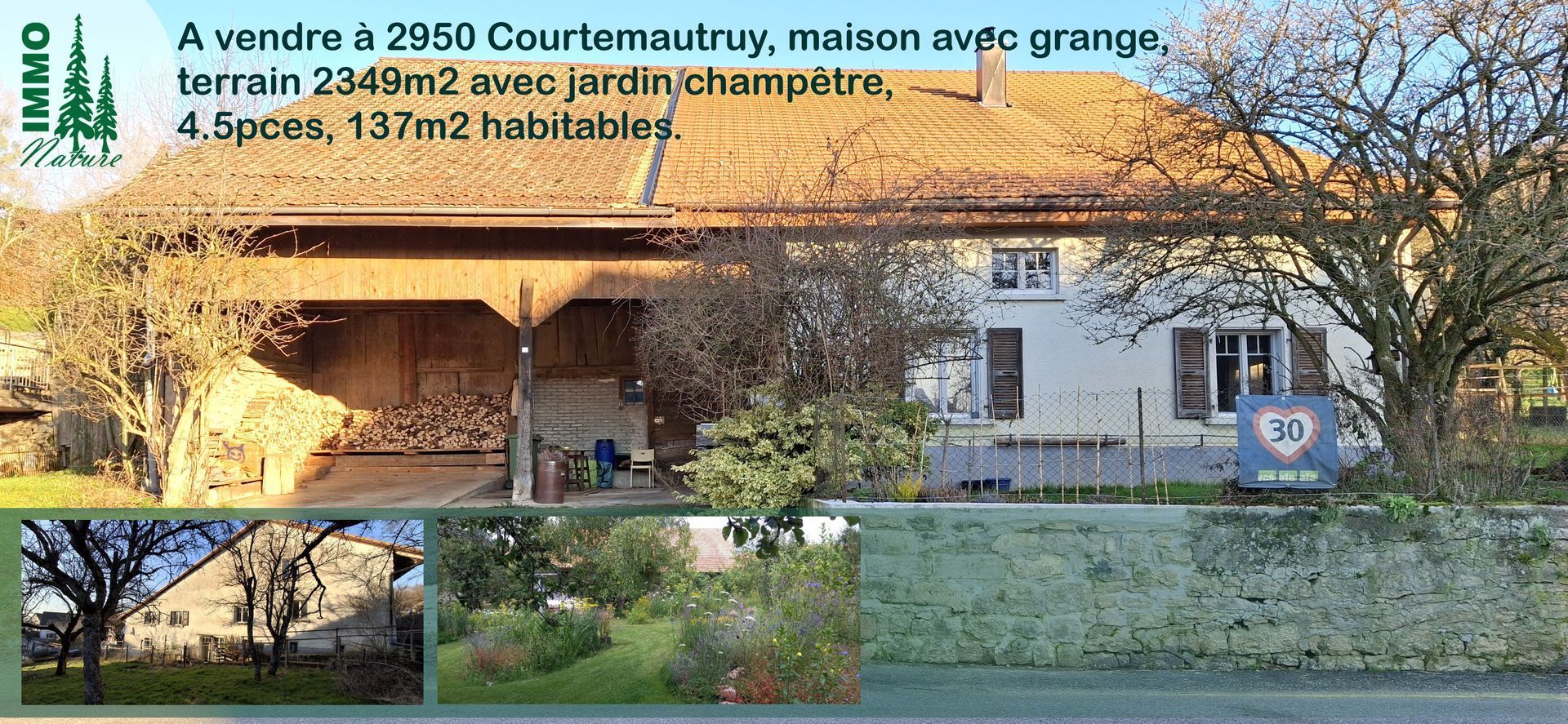 A vendre à 2950 Courtemautruy, route des Romains 11, maison avec ancienne grange, 4.5pces, 137m2 habitables, grand jardin champêtre sur parcelle clôturée de 2349m2.