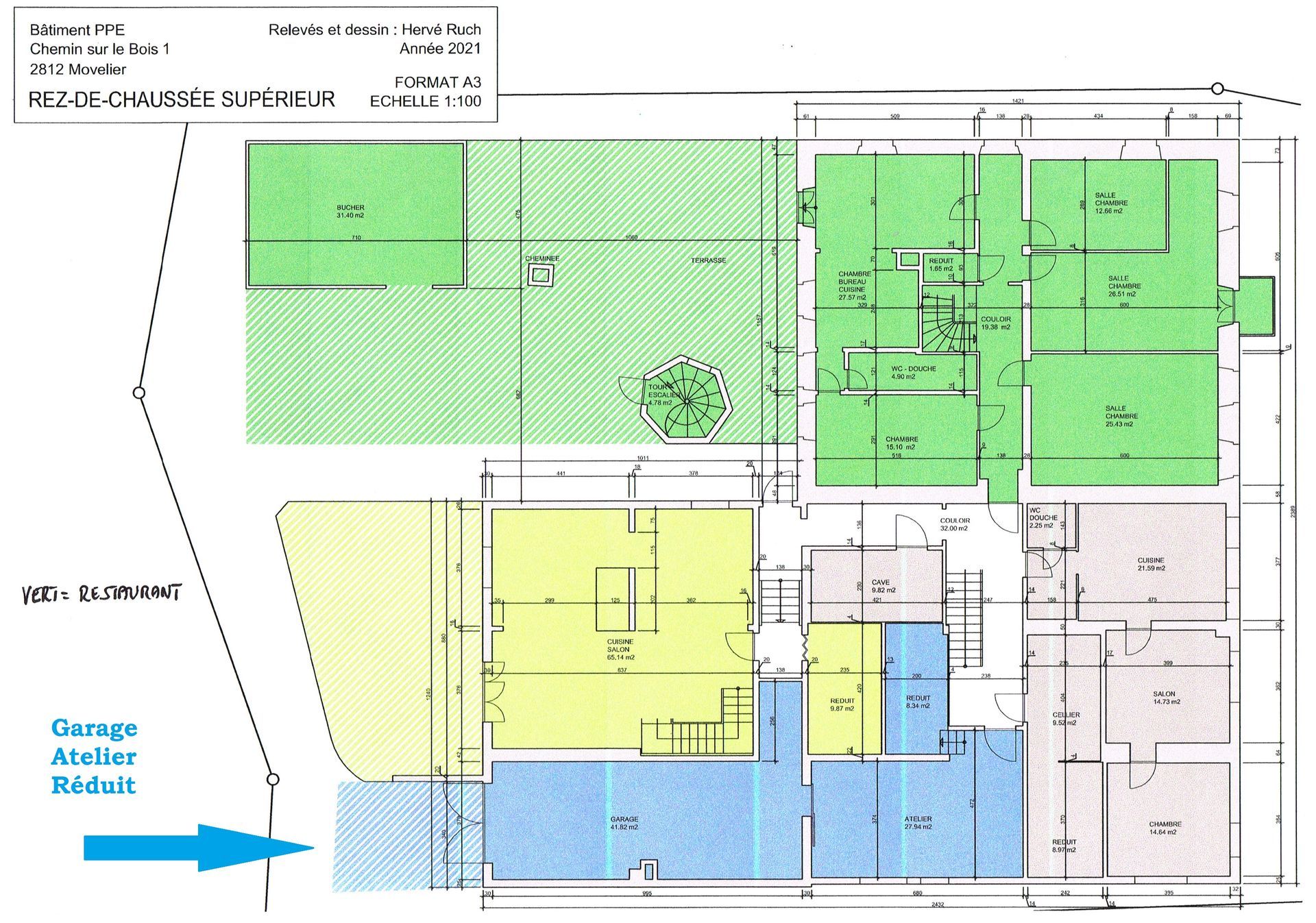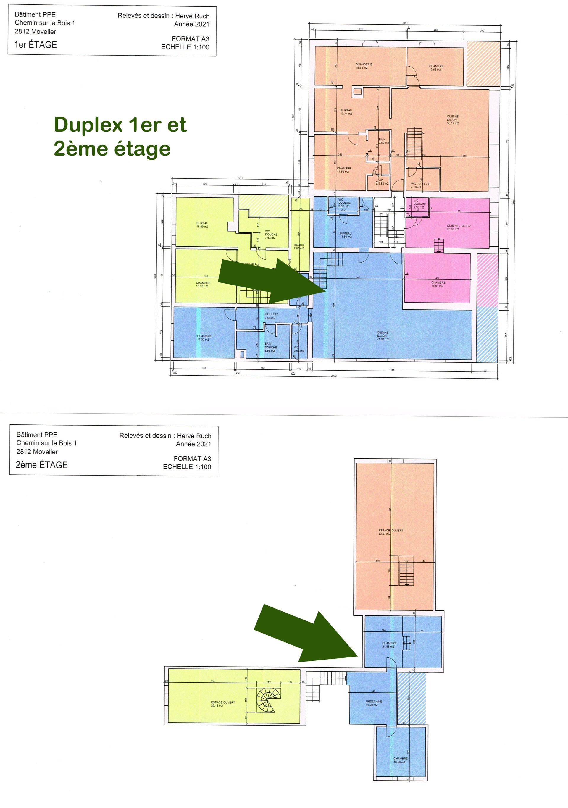Ce duplex fait partie d’un immeuble locatif et d’un restaurant en PPE, soit 189/1000 (le duplex n’est pas sur le restaurant). En bleu sur les plans, no 1818.