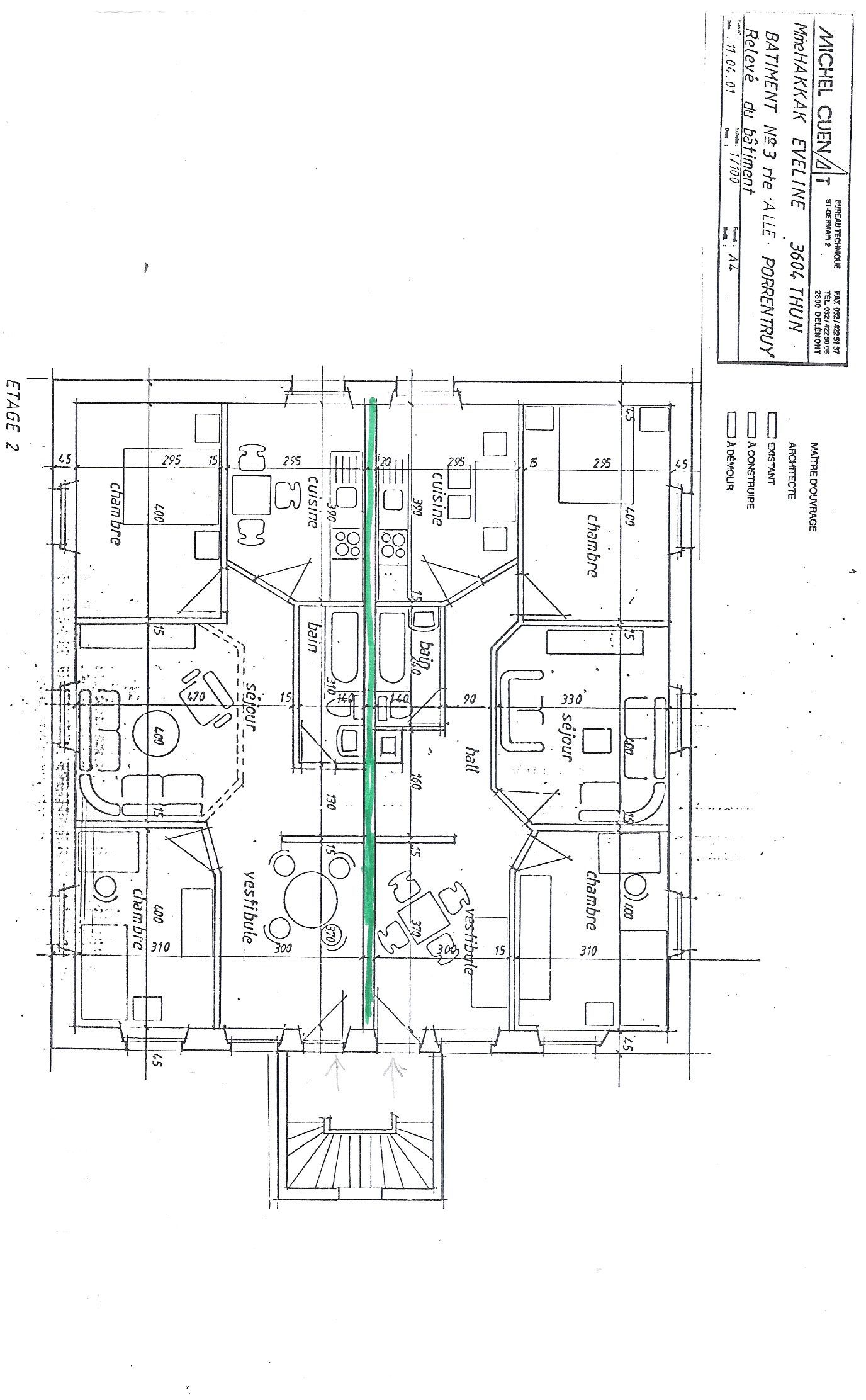 Appartement au 2ème étage, côté route, sans ascenseur, avec cuisine agencée, salle de bain avec baignoire, hall habitable, salon ouvert, 2 chambres (voir plan annexé, partie gauche).
