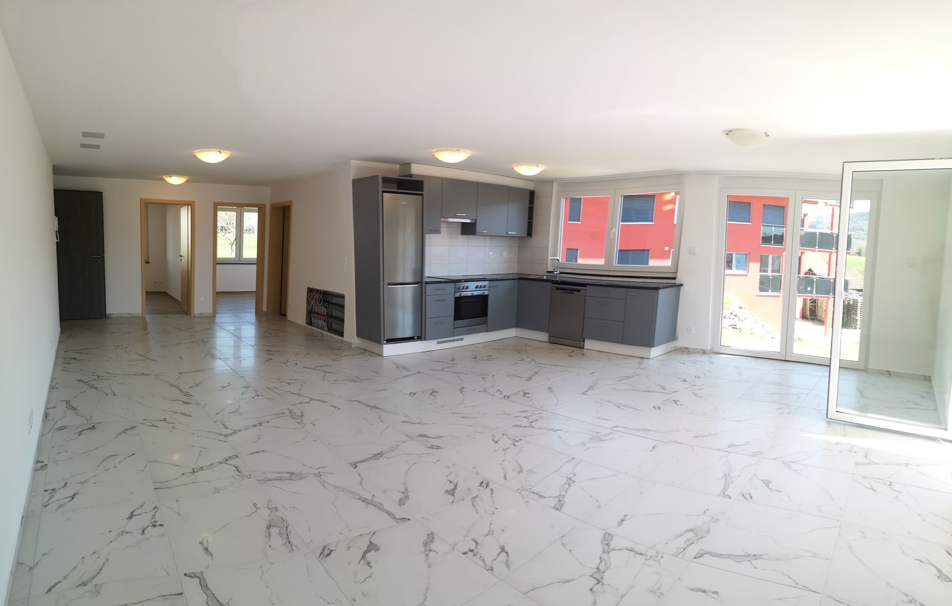 A louer à 2907 Rocourt, rue du Soleil 5, un appartement de 3.5 pces (82m2) au rez-de-chaussée, avec grand balcon couvert, jardin de 63m2 en option, place dans la salle de bain pour machines à laver et à sécher privées. Immeuble moderne de 2025-2026. Libre dès 01.09.2026.