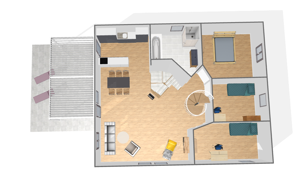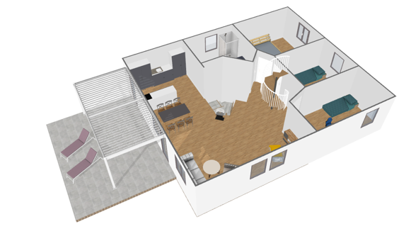 - terrasse env. 25m2 avec pergola bioclimatique à lamelles orientables et stores latéraux intégrés